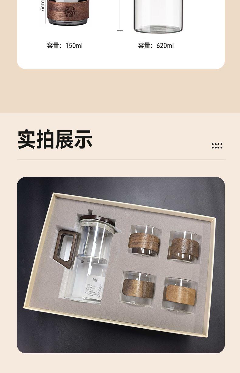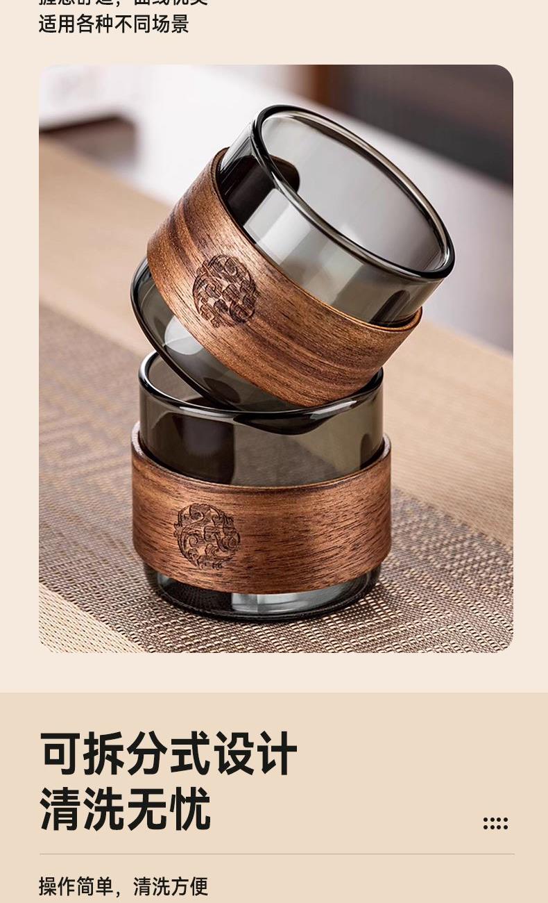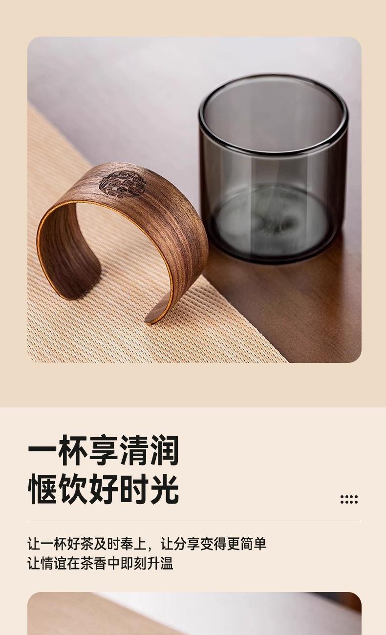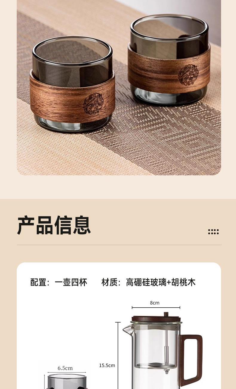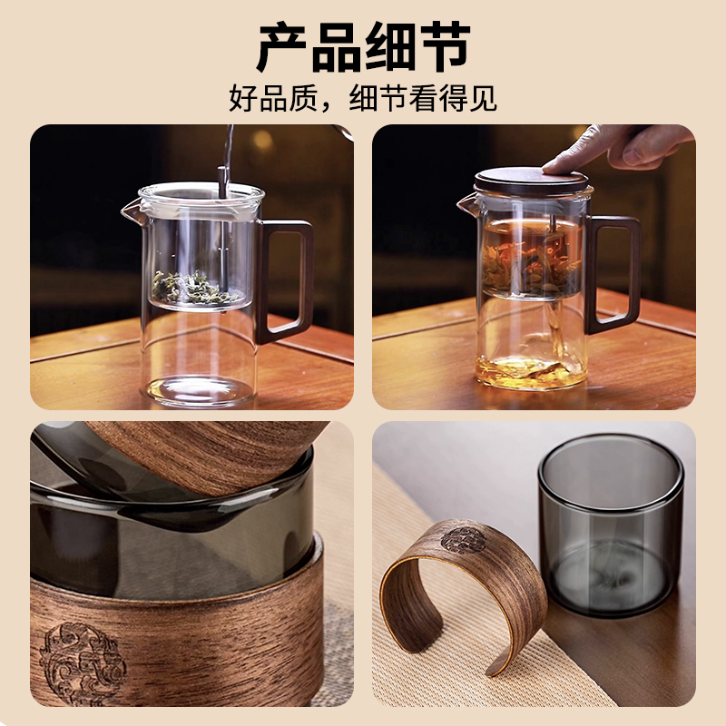 无需专业茶台,不计复杂流程。这套飘逸茶具专为现代生活设计:一壶四杯,配置周全,让您在任何场合都能瞬间布席,温暖待客。无论是办公室的短暂休憩,还是客厅的突然到访,它都能让一杯好茶及时奉上,让分享变得更简单,让情谊在茶香中即刻升温。这不仅是一套茶具,更是一种随心随性的待客智慧。 配置:一壶四杯 材质:高硼硅玻璃+胡桃木 容量:620ml 尺寸:8*15.5cm