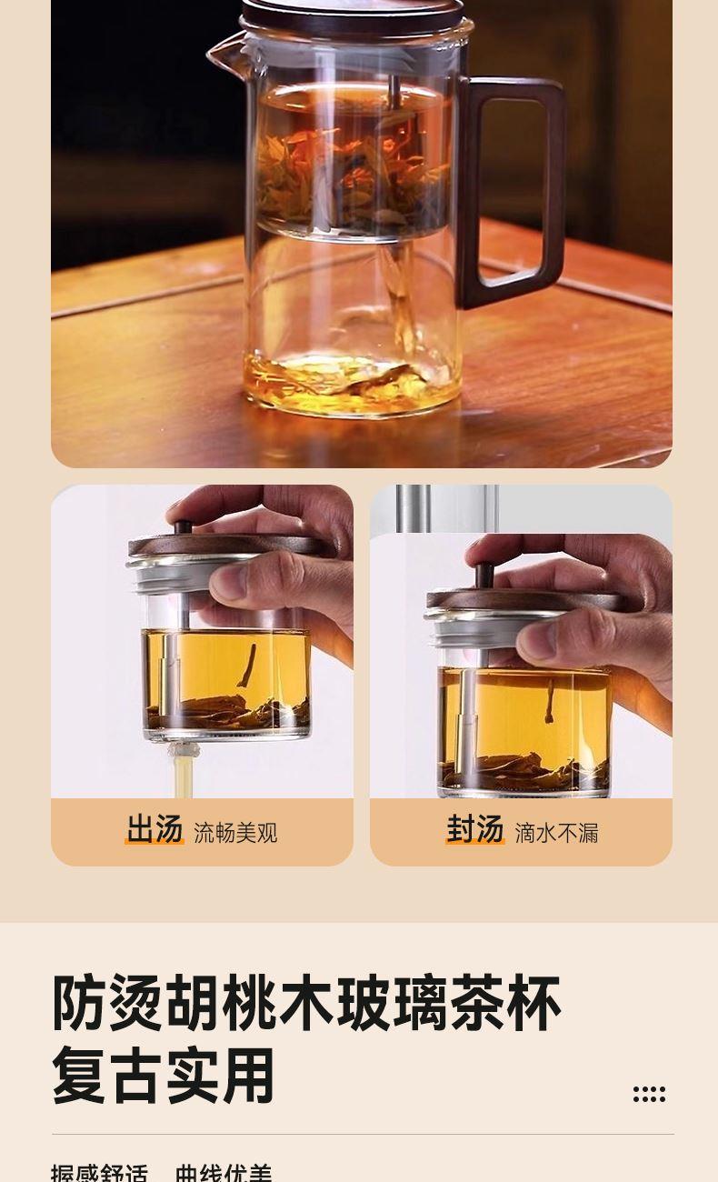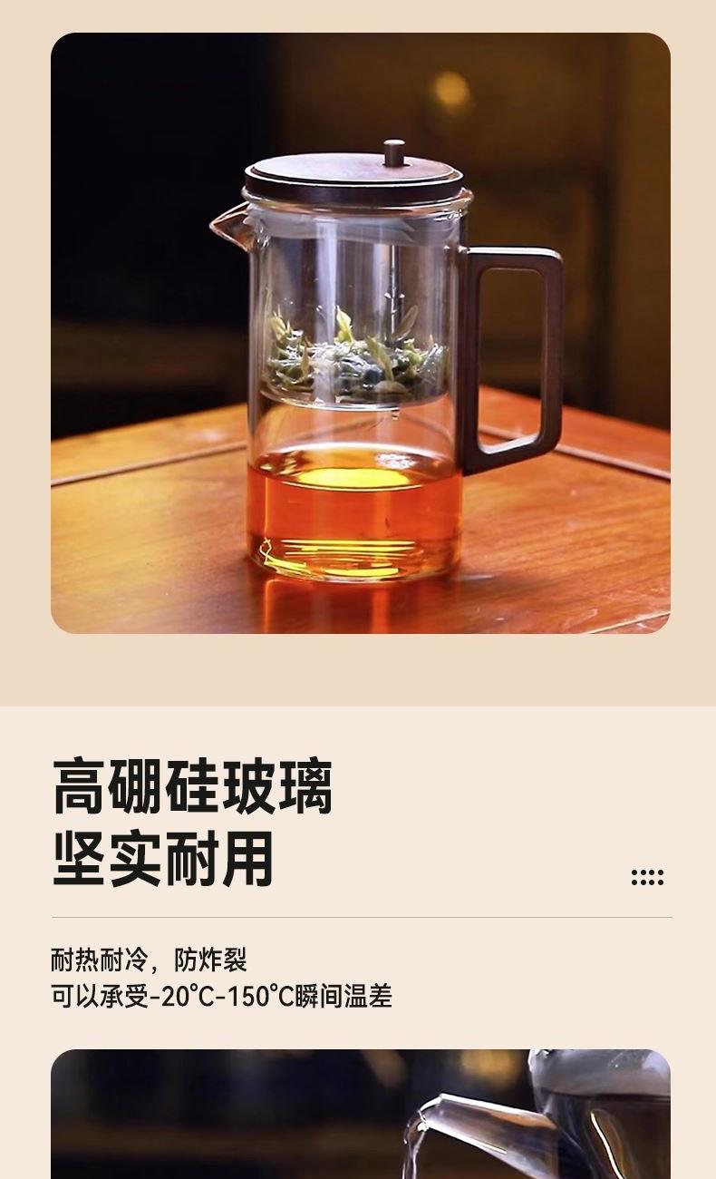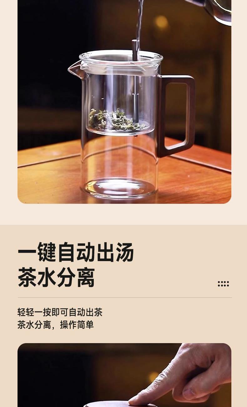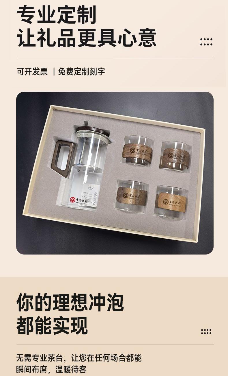 无需专业茶台,不计复杂流程。这套飘逸茶具专为现代生活设计:一壶四杯,配置周全,让您在任何场合都能瞬间布席,温暖待客。无论是办公室的短暂休憩,还是客厅的突然到访,它都能让一杯好茶及时奉上,让分享变得更简单,让情谊在茶香中即刻升温。这不仅是一套茶具,更是一种随心随性的待客智慧。 配置:一壶四杯 材质:高硼硅玻璃+胡桃木 容量:620ml 尺寸:8*15.5cm