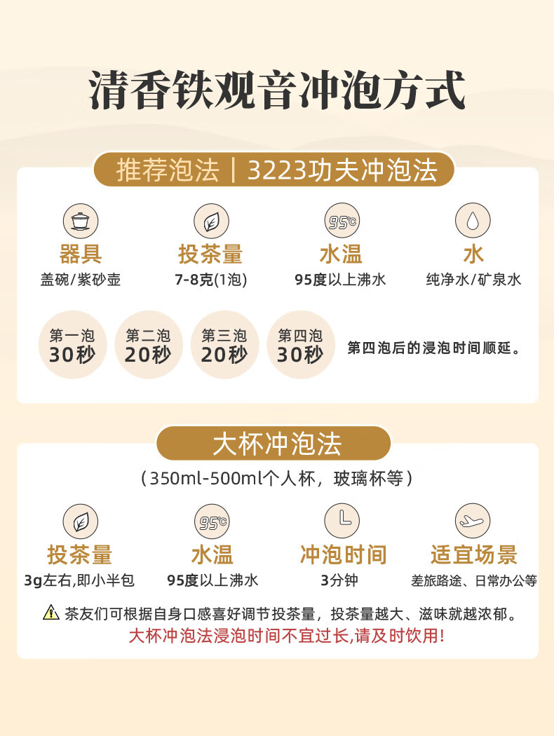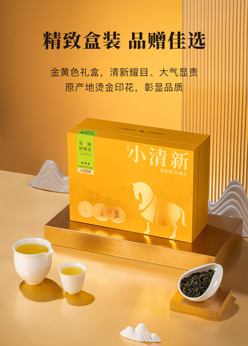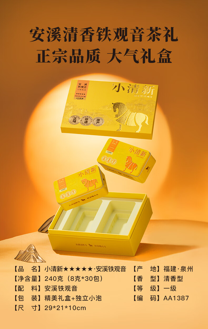 编码:AA1387 产品规格:240克(120克*2罐) 外盒尺寸:29*21*10cm 推荐理由: “入口新、鲜又香” 正宗原产、非遗技艺; 高质价比、大气礼盒装,自饮、送礼皆宜; 【升级亮点】 统一产品矩阵包装形象; 外包装强化突出产品“口味特征”与“核心卖点”;
