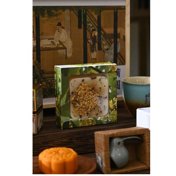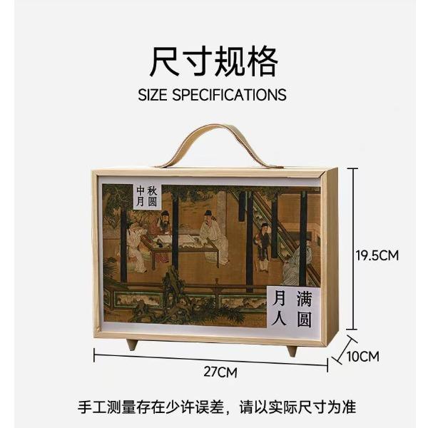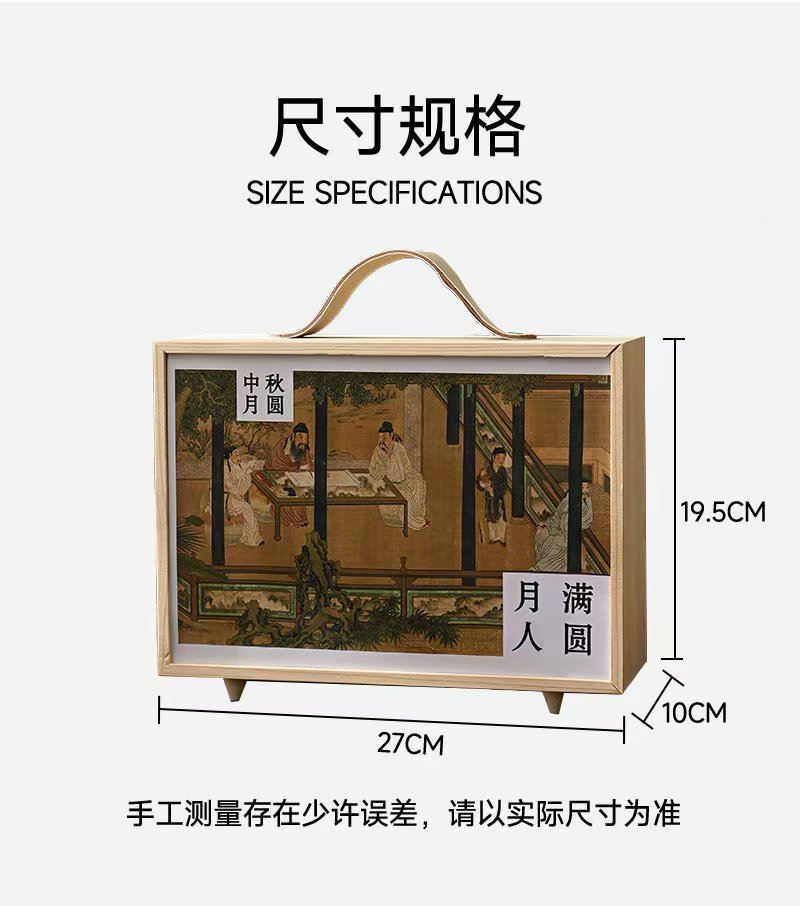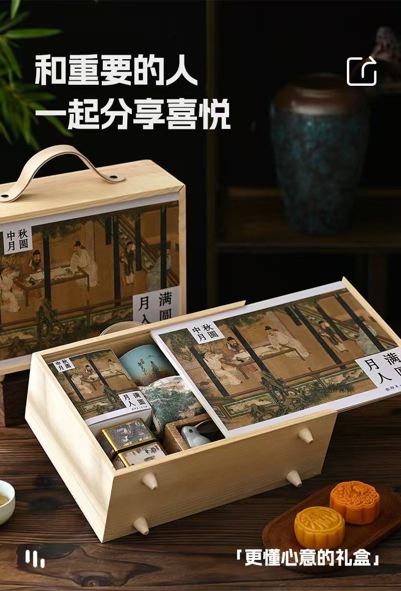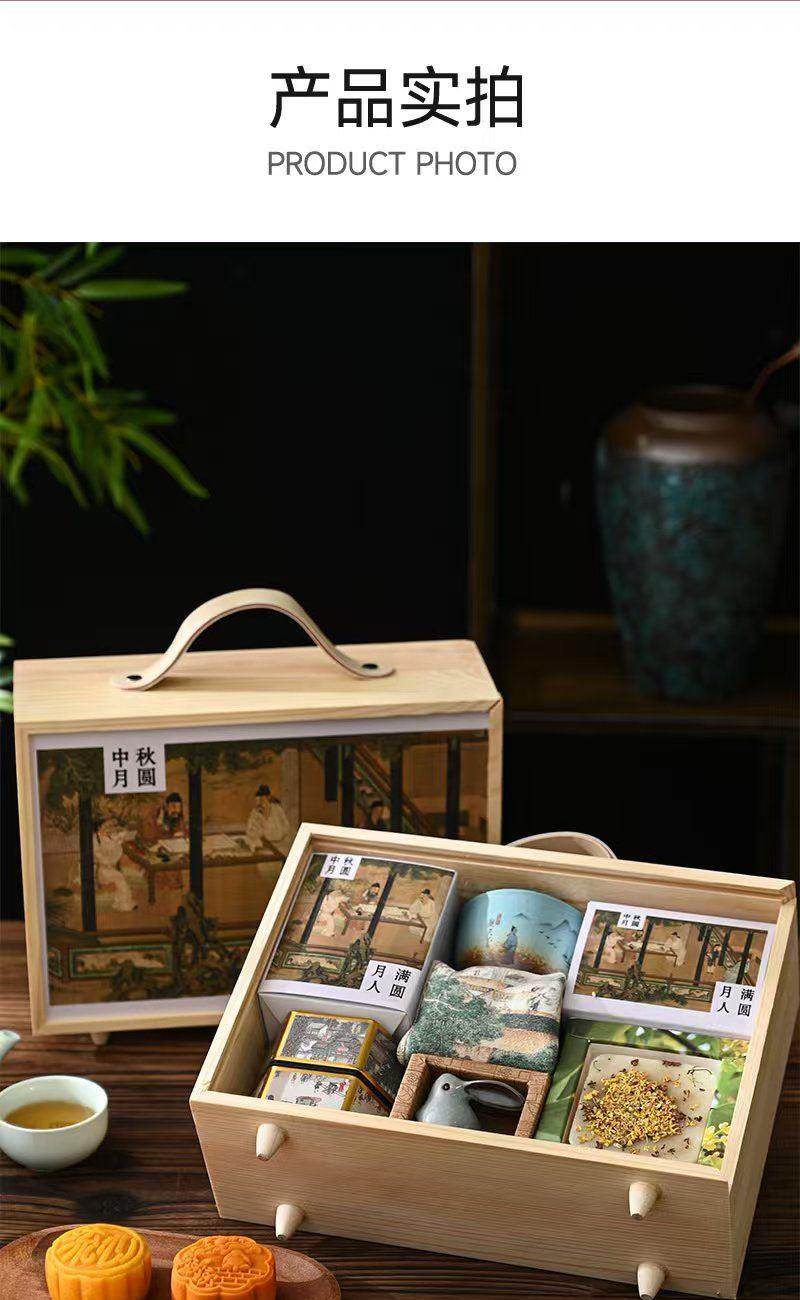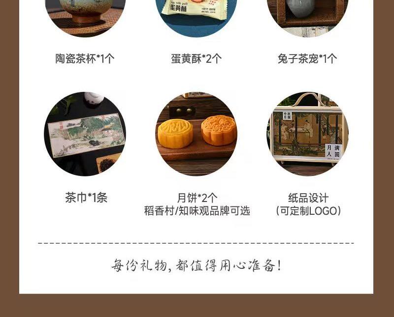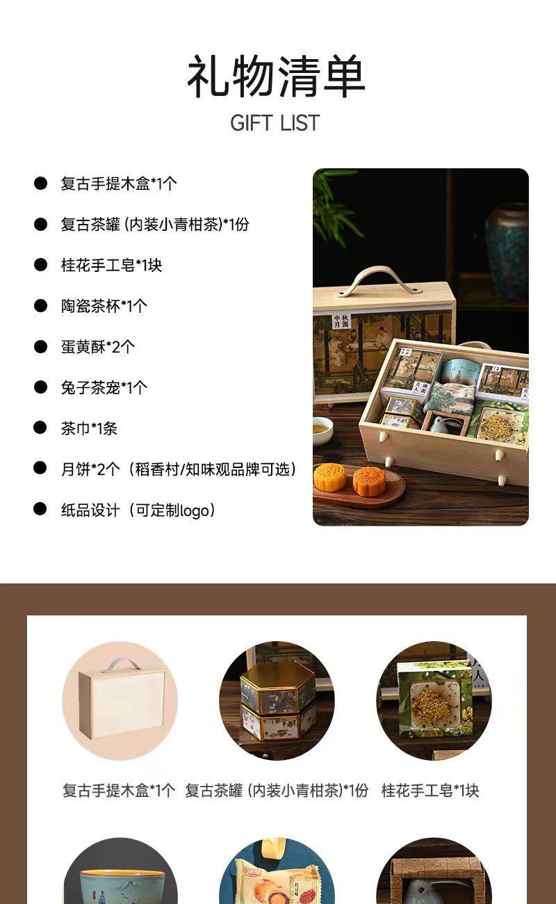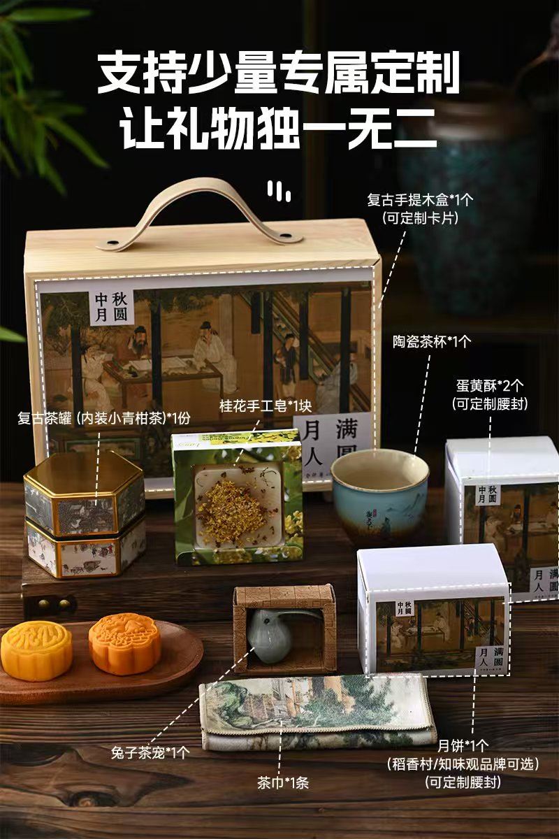 配置: 复古手提木盒*1 复古茶罐(内装小青柑茶)*1 桂花手工皂*1 陶瓷茶杯*1 比比赞蛋黄酥*2 兔子茶宠*1 茶巾*1 稻香村月饼*2 纸品设计(可定制logo) 礼盒尺寸:27X19.5X10CM
