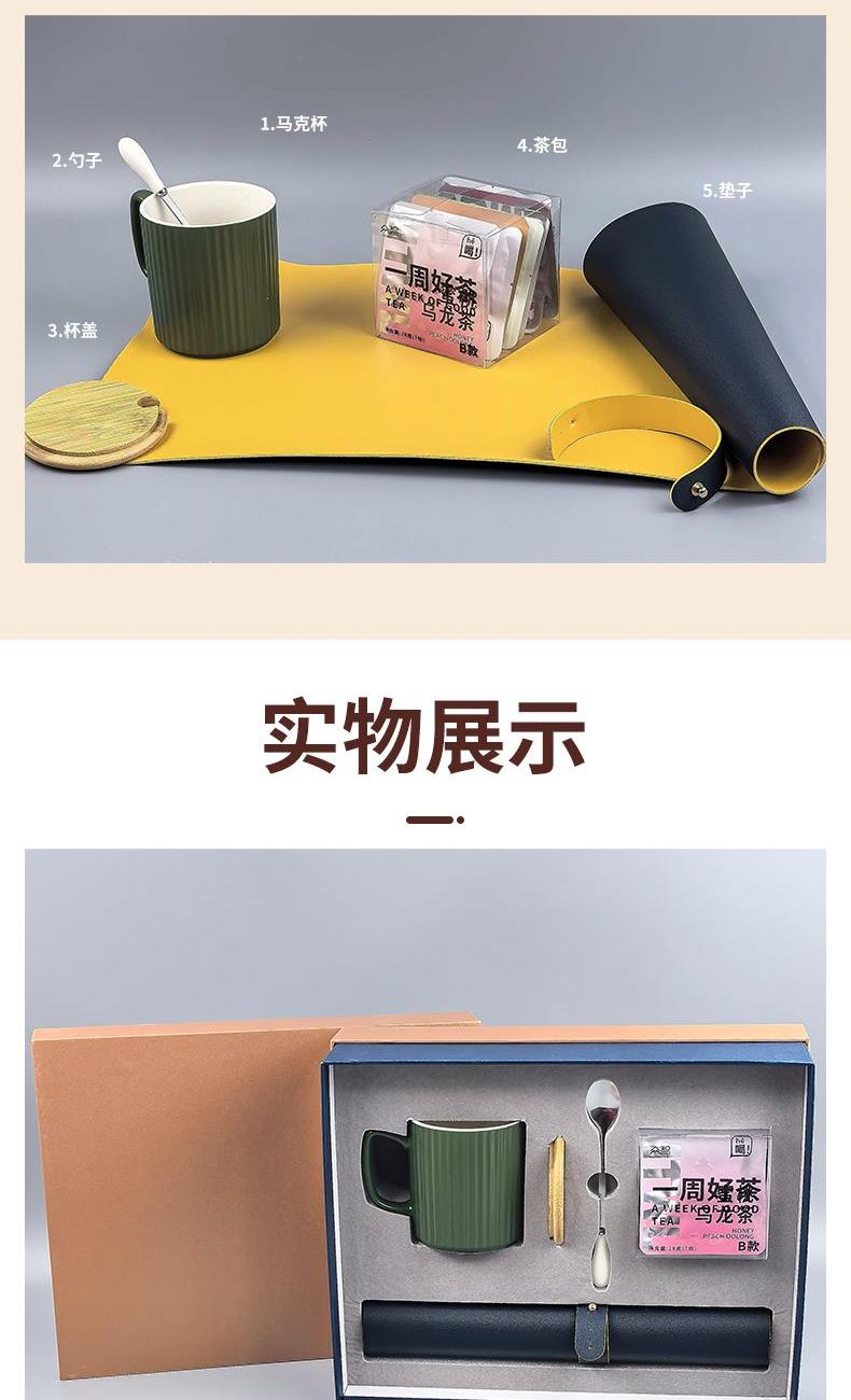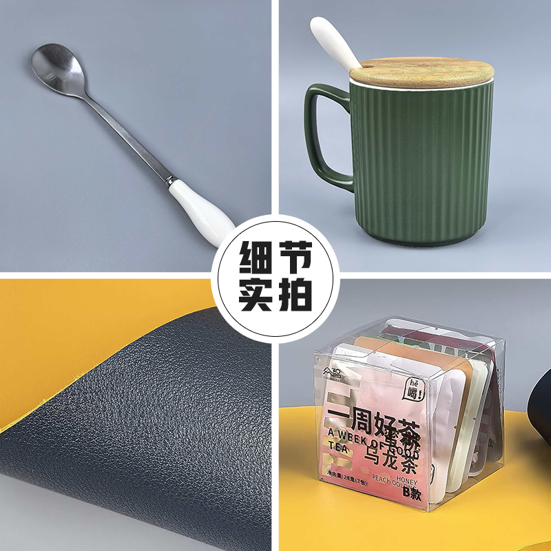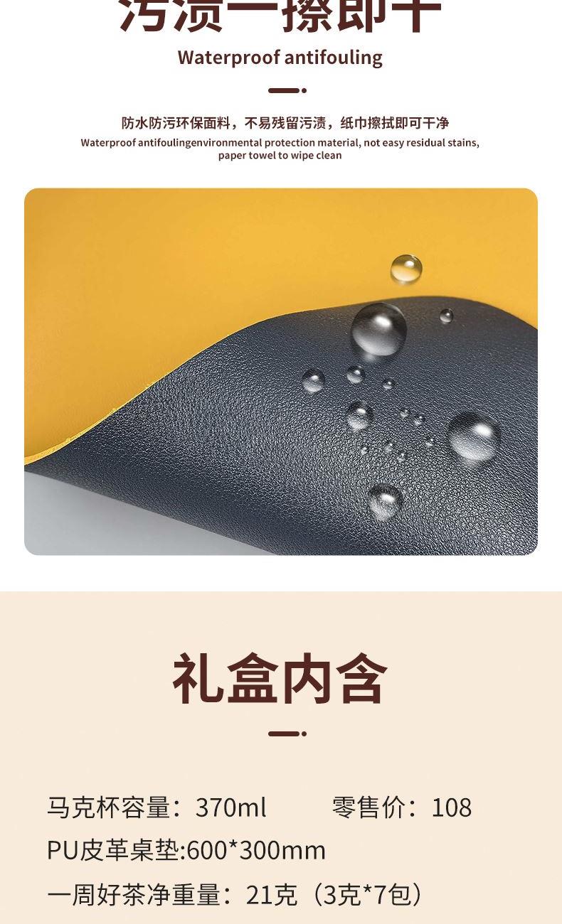 于职场方圆之间,寻一方滋养身心的自在天地。这份办公休憩套装,内含三样充满温度的物件,为您构建一个专属的松弛空间,这不仅是三件物品,更是一种张弛有度的生活哲学。“方”是工作的秩序,“圆”是身心的调和。一套「方圆养息」,助您在高效拼搏之余,懂得适时休憩,于方圆之内,涵养从容不息的生命力。 马克杯 材质:陶瓷+木盖+勺子 容量:370ml PU皮革桌垫 尺寸:600*300mm 材质:双面PU皮 一周好茶 净重量:21克(3克*7包)