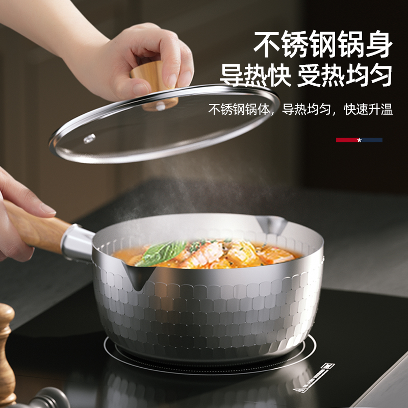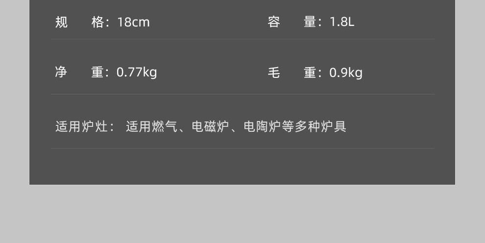 口 径:18cm 材 质:430不锈钢 产品净重:0.77kg 产品毛重:0.90kg 整箱重量:19.6kg 简洁外观锤目纹雪花工艺,钢化透明锅盖; 健康0涂层严选高品质铁素体不锈钢,安全放心; 加深锅型炖、煮、煲大容量不溢锅;双侧V型导流嘴倒汤不易滴漏; 导热快速加厚不锈钢锅身,导热迅速升温快。