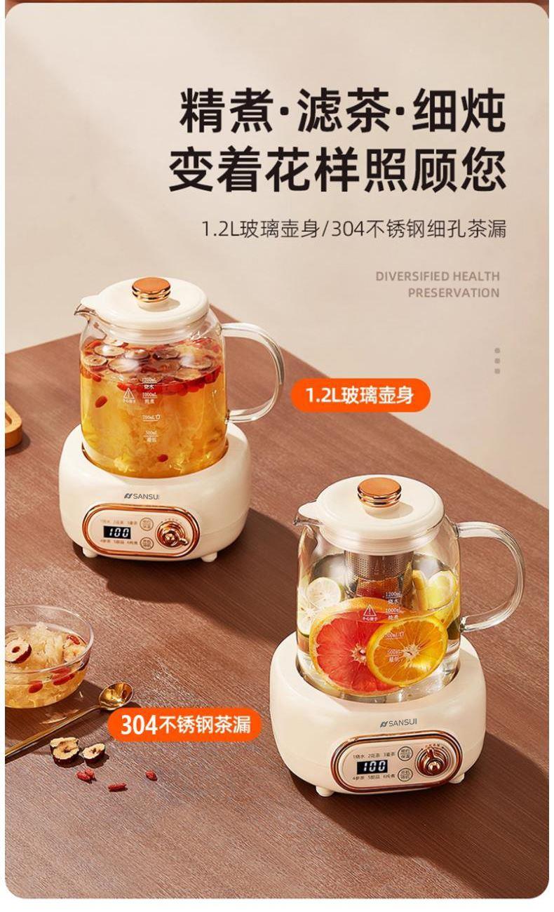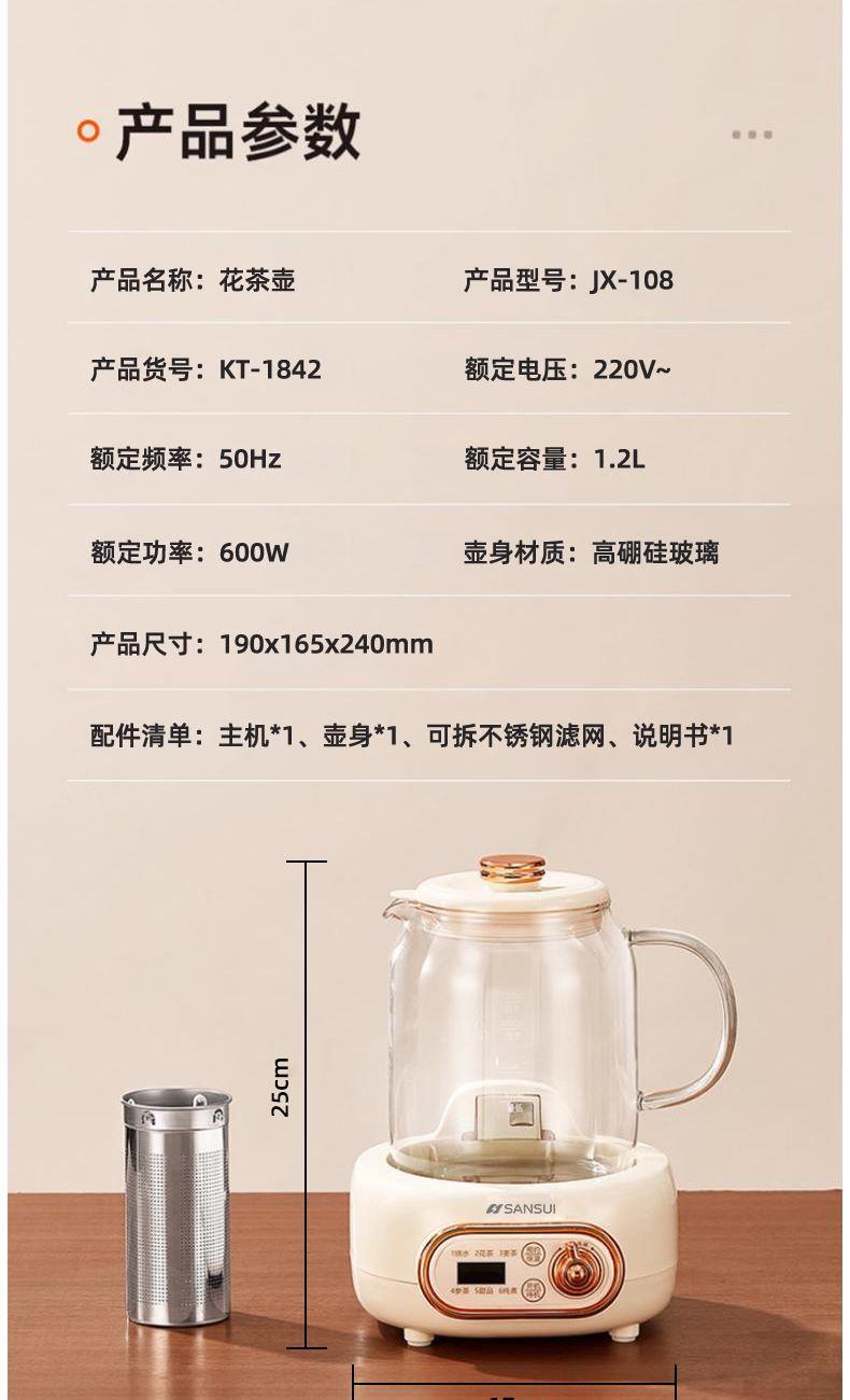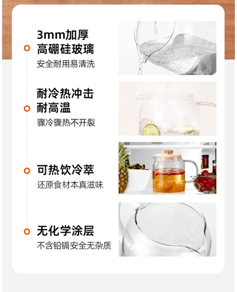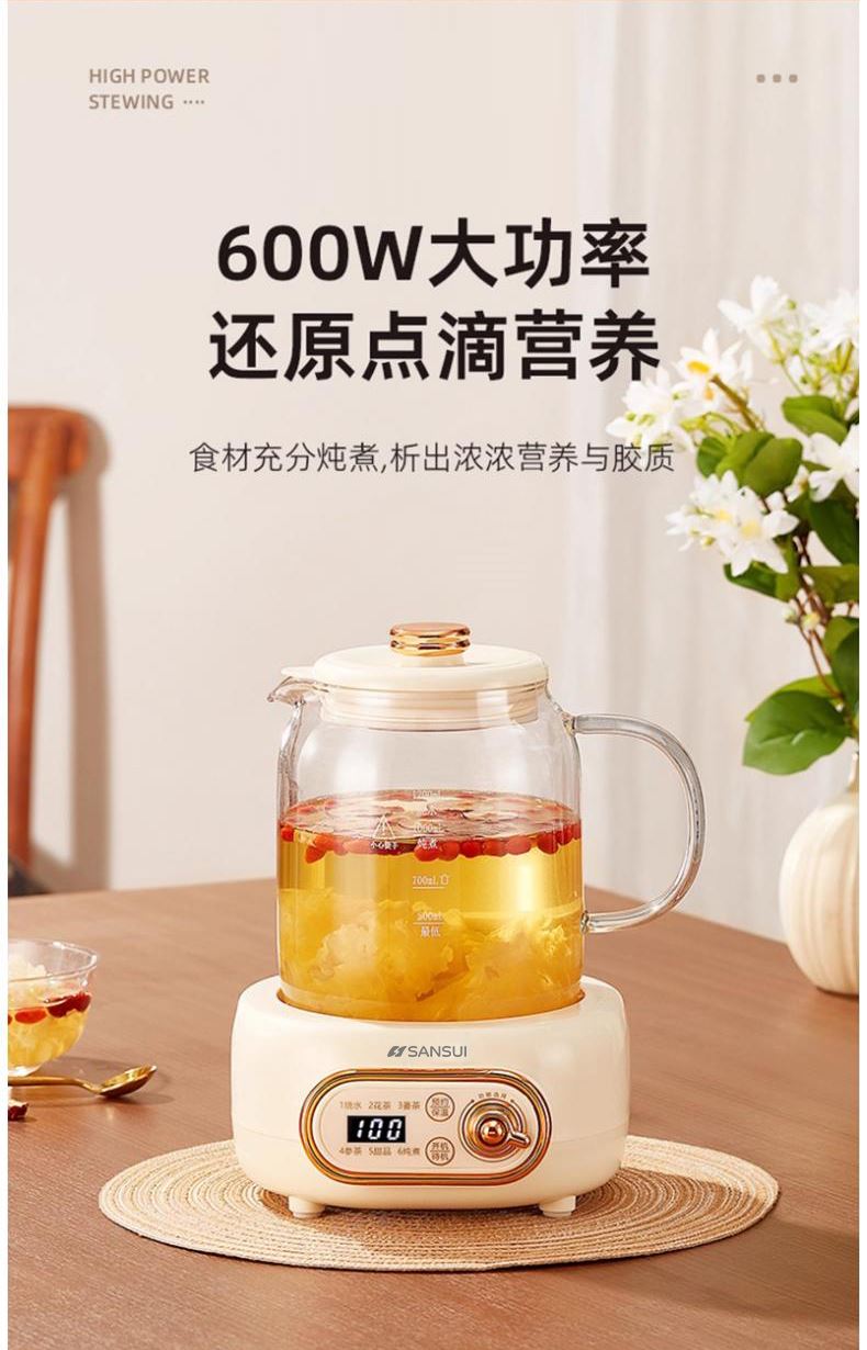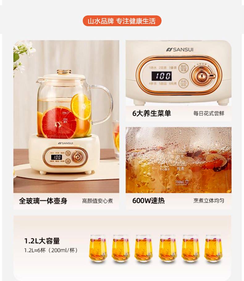 功率:600W 容量:1.2L 全玻璃0涂层0金属0胶水0缝隙 精炖锁鲜柔声煮、6大养生菜单 304不锈钢茶滤 40-90°可调、长效保温 24小时智能预约、高硼硅玻璃 1.2L大容量、120S提壶记忆 包装方式:彩盒+网购包装