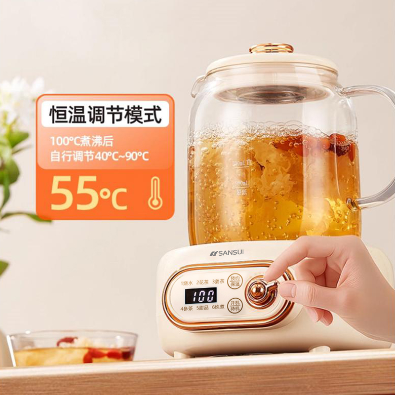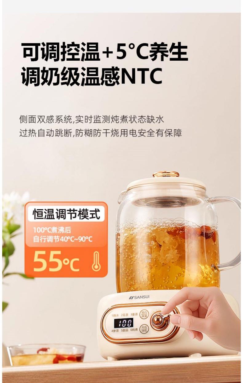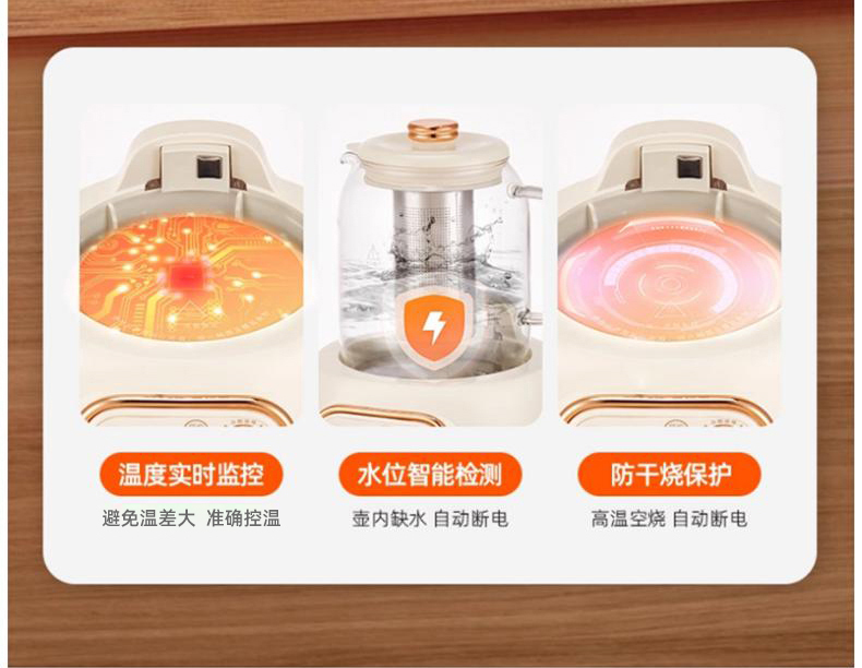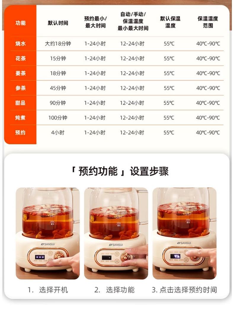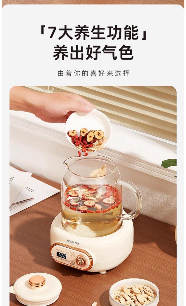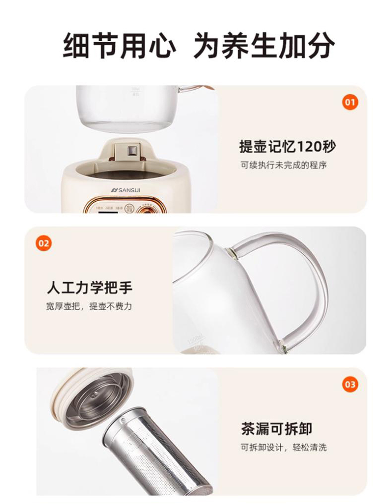 功率:600W 容量:1.2L 全玻璃0涂层0金属0胶水0缝隙 精炖锁鲜柔声煮、6大养生菜单 304不锈钢茶滤 40-90°可调、长效保温 24小时智能预约、高硼硅玻璃 1.2L大容量、120S提壶记忆 包装方式:彩盒+网购包装