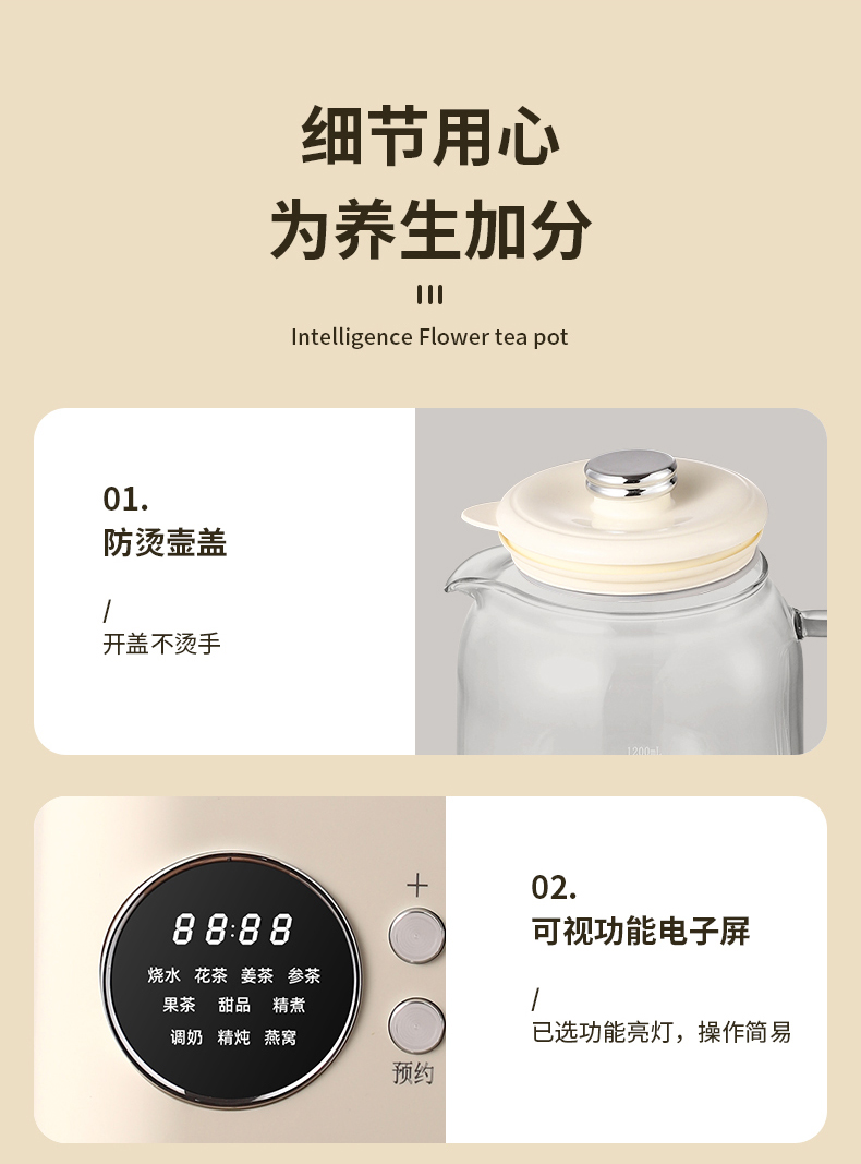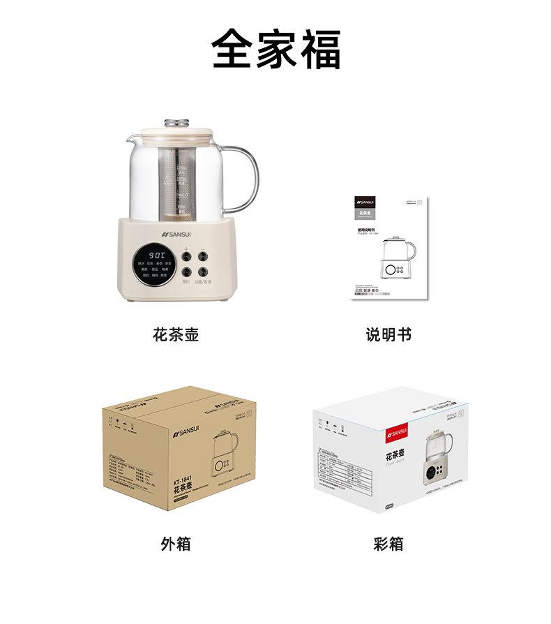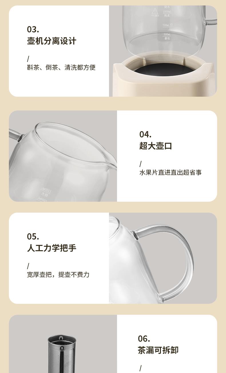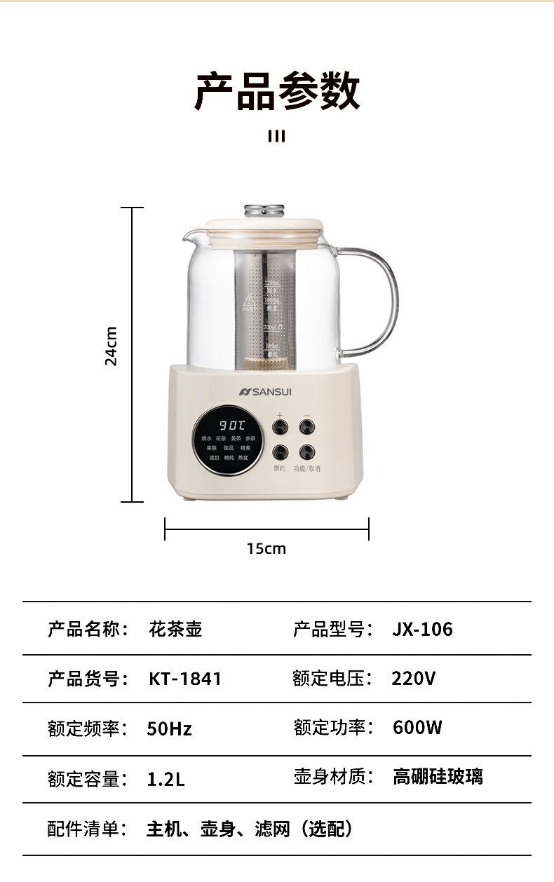 功率:600W 容量:1.2L 全玻璃壶体0涂层0胶水0缝隙 加热无异味、加厚高硼硅玻璃耐骤冷骤热 聚能发热盘均匀加热、304不锈钢茶滤 4位数码显示、四重安全保护 40-90°恒温可调、10大功能菜单 24小时长时恒温、可煮可泡可冷萃、轻音炖煮 1.2L大容量、24小时预约、提壶记忆功能 包装方式:彩盒+网购包装